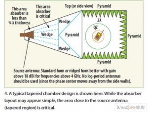 通常只有源和靜區之間存在鏡面反射的側墻區域需要昂貴的側墻吸波材料。在其它的例子中(例如在位于源后面的發射端墻處),可以使用更短的吸波材料。在靜區周圍一般使用楔形吸波材料,這樣有助于減少任何后向散射,并防止對測量造成負面影響。