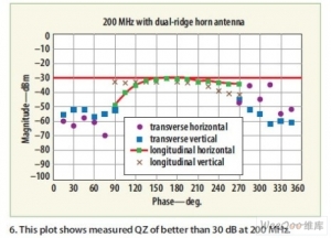在錐形暗室中,源天線非常關鍵,特別是在較高頻率時(如2GHz以上),此時暗室行為對細小的變化更加敏感(圖4)。整個錐體的角度和處理也很重要。角度必須保持恒定,因為錐體部分角度的任何變化將引起照射誤差。因此測量時保持連續的角度是實現良好錐形性能的關鍵。