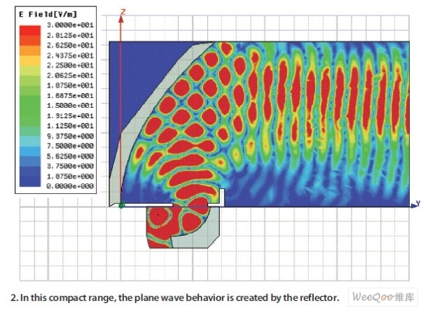 近場和反射測量也可以在室內測試場進行,而且通常是近場或緊縮測試場。在緊縮測試場中,反射面會產生一個平面波,用于模擬遠場行為。這使得可以在長度比遠場距離短的測試場中對天線進行測量。在近場測試場中,AUT被放置在近場,接近天線的表面上的場被測量。隨后測量數據經過數學轉換,即可獲得遠場行為(圖2)。圖3顯示了在緊縮測試場中由靜區上的反射面產生的平面波。