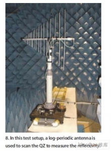 雖然從前面的討論中可以清楚地知道,在低頻時錐形暗室可以比矩形暗室提供更多的優勢,但測量數據表明錐形暗室具有真正的可用性。圖5 是一個200MHz至40GHz的小型錐形暗室,外形尺寸為12×12×36英尺,靜區大小為1.2米。這里采用了一個雙脊寬帶喇叭天線照射較低頻率的靜區。然后利用安捷倫(Agilent)公司的N9030A PXA頻譜分析儀以一個對數周期天線測量靜區。在200MHz點測得的反射率大于30Db(如圖6所示)。圖7 和 圖8分別顯示了饋源頂部的源天線和靜區中的掃描天線。