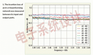 為展示該設計方法,設計了一個用于3.4到3.6GHz頻段的四束天線波束成型器。用安捷倫科技的(www.agilent.com)N5230A矢量網絡分析儀對其性能進行了測量,N5230A在工作時與同樣來自安捷倫的也工作在3.4到3.6GHz范圍的U3042A多口測試裝置連接。圖3、圖4和圖5顯示的是基于該設計方法的典型八波束波束成型網絡的結果。
